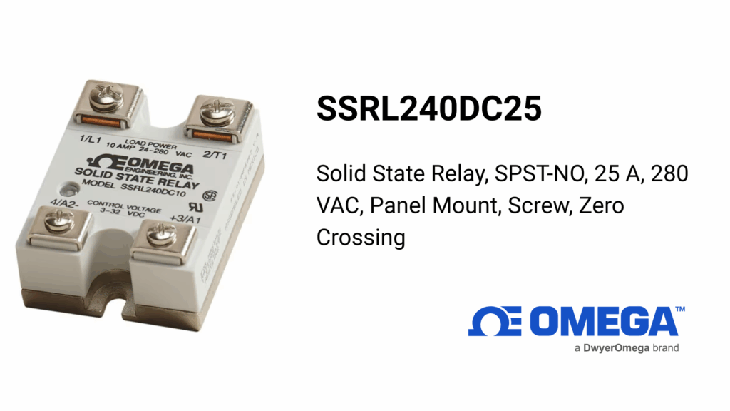 The Omega SSRL240DC25 is a DC-input, AC-output solid-state relay designed for high-performance, long-life operation in industrial automation, temperature control, and power management systems. With a 25 A output capacity and 280 VAC operating voltage, this SPST-NO relay delivers noise-free switching and exceptional reliability—ideal for demanding industrial environments.